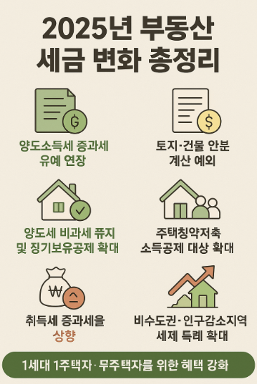 2025년 부동산 세제는 실수요자 보호와 다주택자 규제 완화를 동시에 추구하는 방향으로 개편되고 있습니다. 정부는 과도한 세부담으로 인한 시장 왜곡을 최소화하면서도, 투기 수요는 억제하겠다는 기조 아래 세율과 공제 제도를 조정하고 있으며, 특히 취득세·보유세·양도소득세 등 핵심 세목에 다양한 변화가 예정되어 있습니다. 실수요자, 1주택자, 다주택자 등 각각의 상황에 따라 영향을 미치는 정도가 다르므로 정확한 정보와 전략적 대응이 필요합니다. 본문에서는 2025년 기준 주요 부동산 세금 변화 사항을 항목별로 정리합니다.